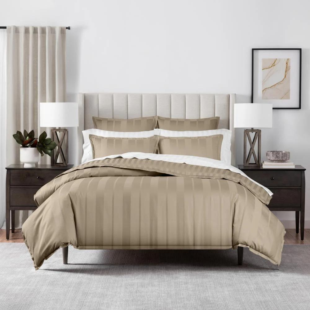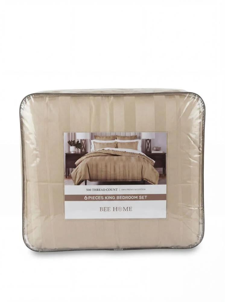 يتميز طقم اللحاف الفندقي المقلم باللون البيج بتصميمه الهادئ والأنيق الذي يمنح غرفة النوم أجواء دافئة ومريحة. النقشة المقلمة الكلاسيكية تضيف لمسة فندقية فاخرة تجعل السرير يبدو أكثر ترتيبًا وأناقة.