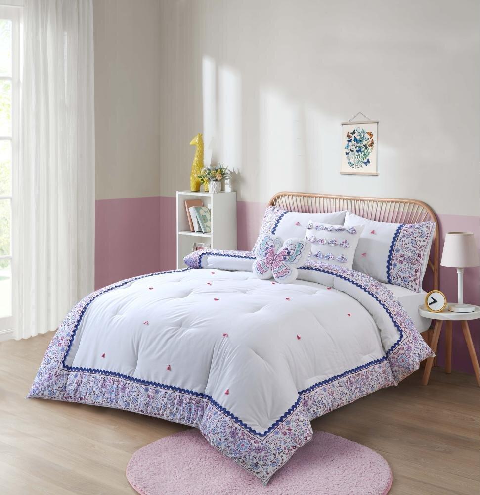 • التصميم: حاشية أنيقة مع نقوش زهورية ناعمة بألوان هادئة تأتي معاه وسائد ديكورية لإعطاء لمسة فاخرة لغرفة النوم .