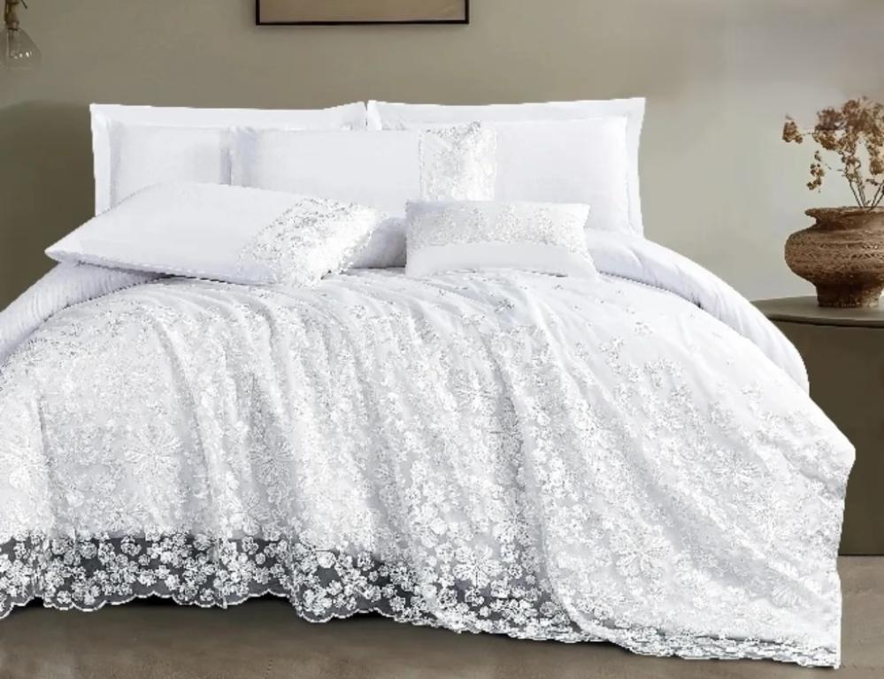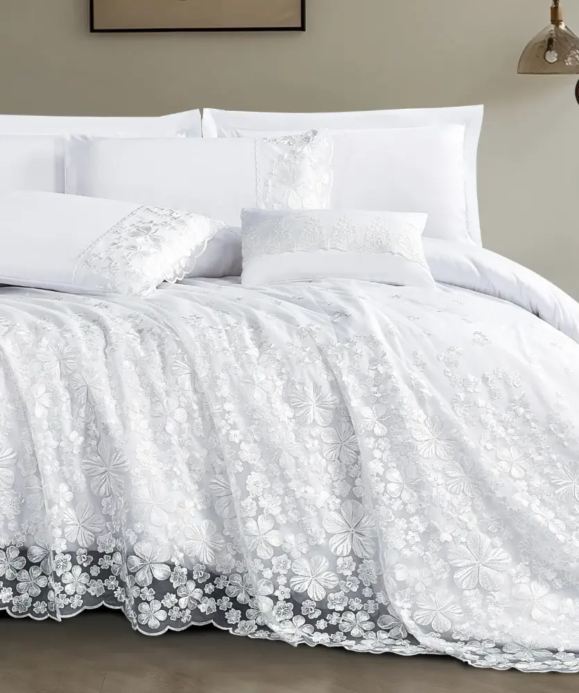 طقم لحاف دانتيل مزدوج 8 قطع PASSION باللون الأبيض الفاخر وتطريز زهور أنيق يمنح غرفة نومك لمسة راقية وإحساسًا بالفخامة ,خامة ناعمة وتصميم مميز مثالي للعرسان ولمحبي الديكور الكلاسيكي .