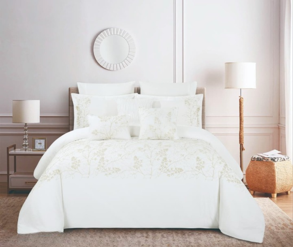 طقم لحاف ملكي مزدوج 9 قطع بتصميم زهري ناعم وألوان هادئة ليمنح غرفتك مظهراً فاخراً وإحساساً بالراحة المثالية.