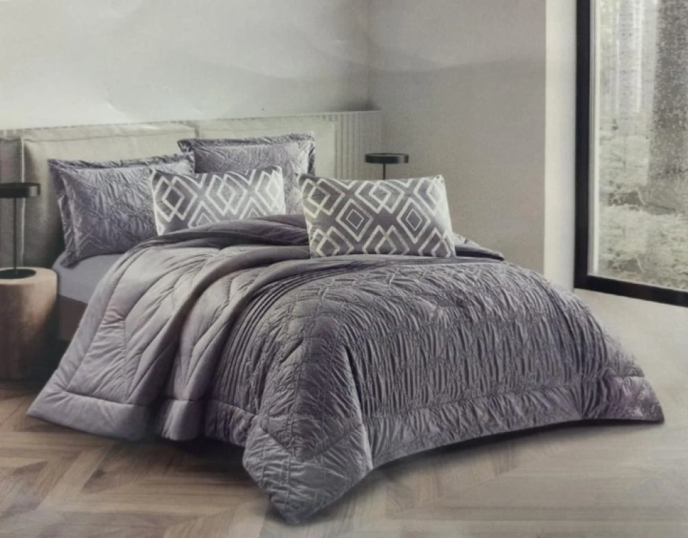 • التصميم: لحاف بتفاصيل خياطة هندسية أنيقة، مع مخدات مزخرفة بنقش فني يضفي لمسة فخامة على طقم النوم.