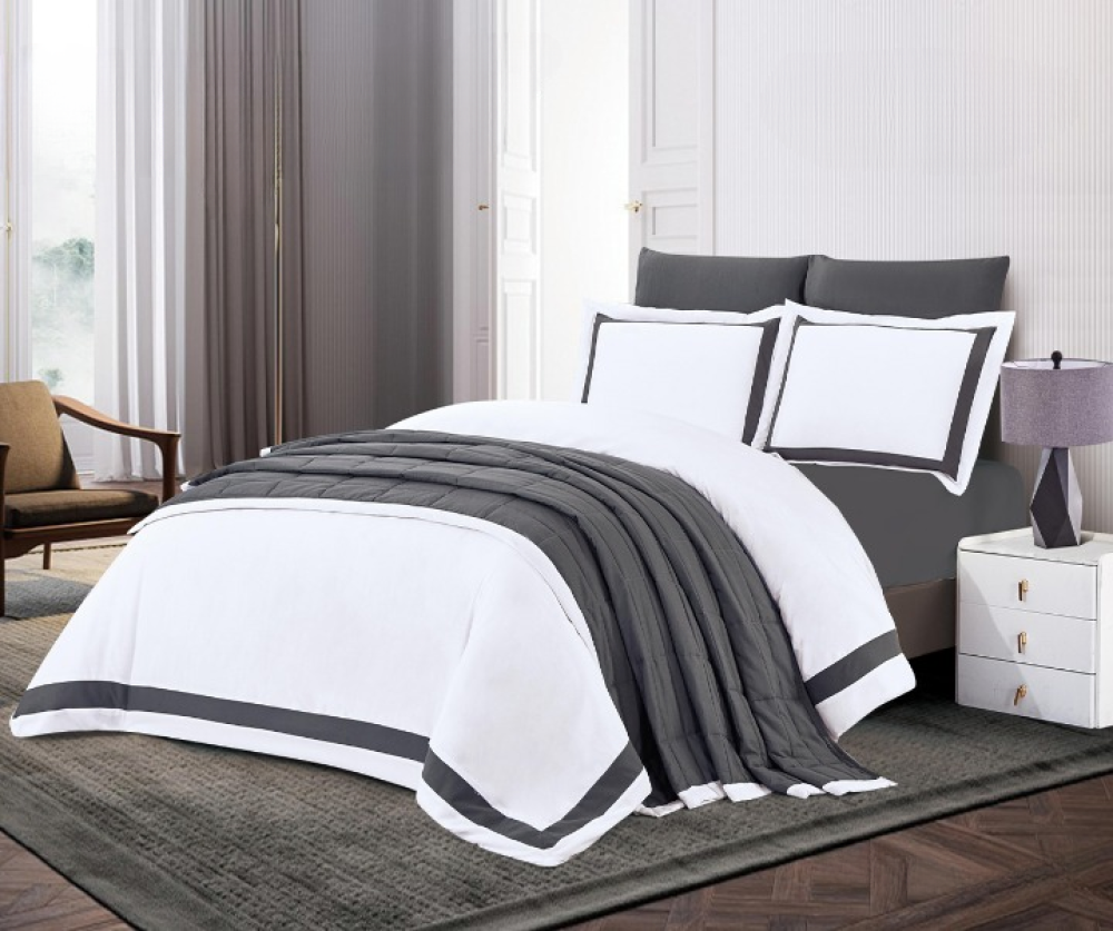 • التصميم : مفرش باللون الأبيض مع تدرجات رصاصية تضفي لمسة من الرقي على الغرفة.