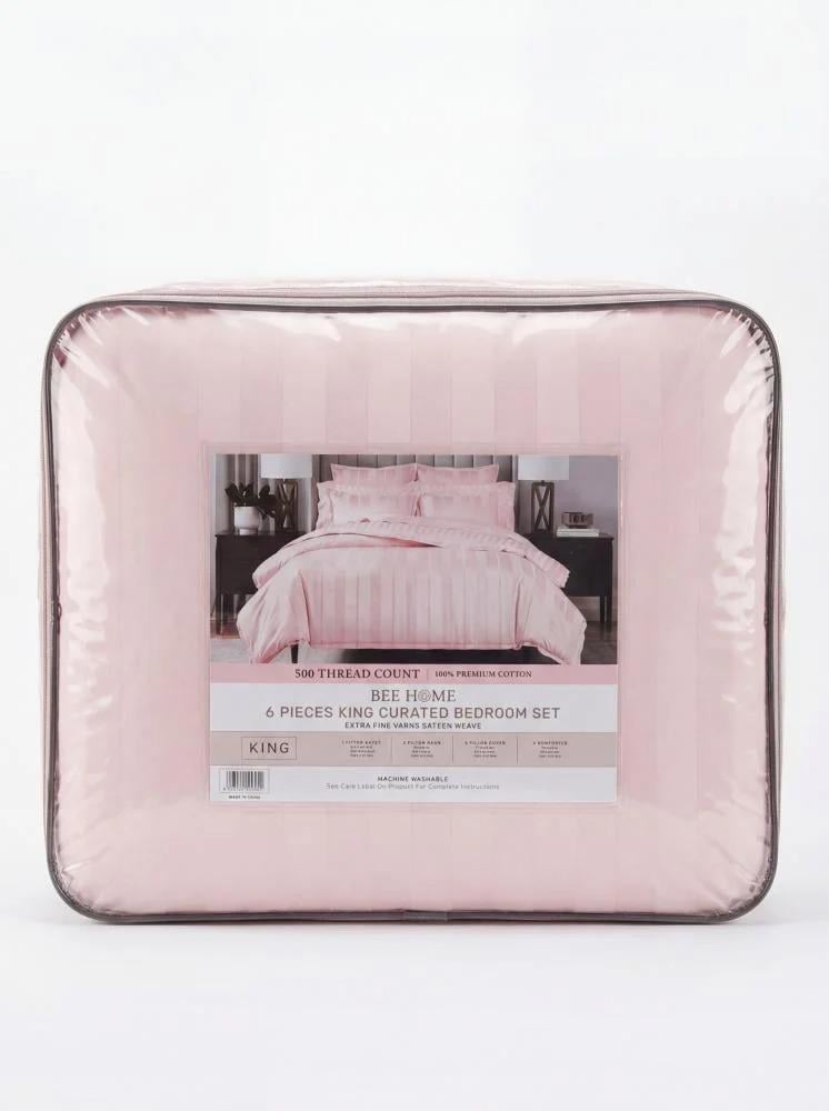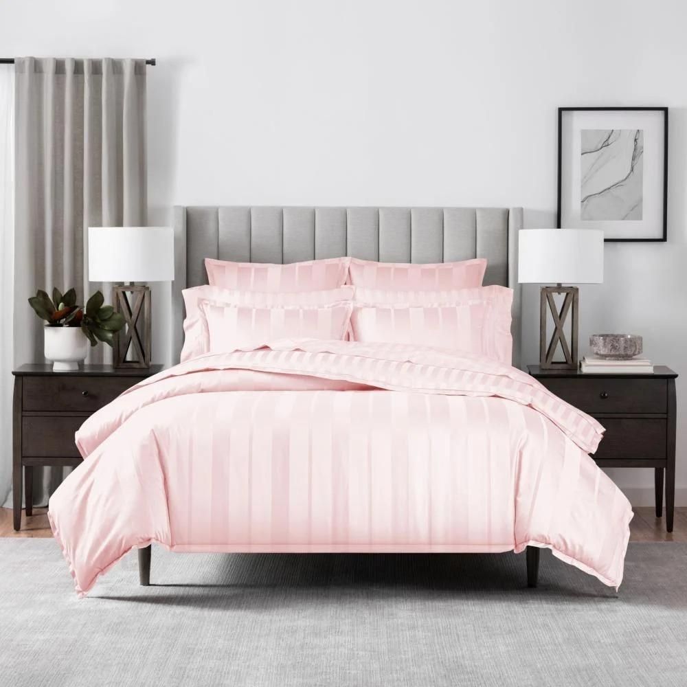 استمتع بأجواء هادئة ولمسة أنثوية راقية مع طقم اللحاف الفندقي المقلم بلون وردي من OVR SLEPT.