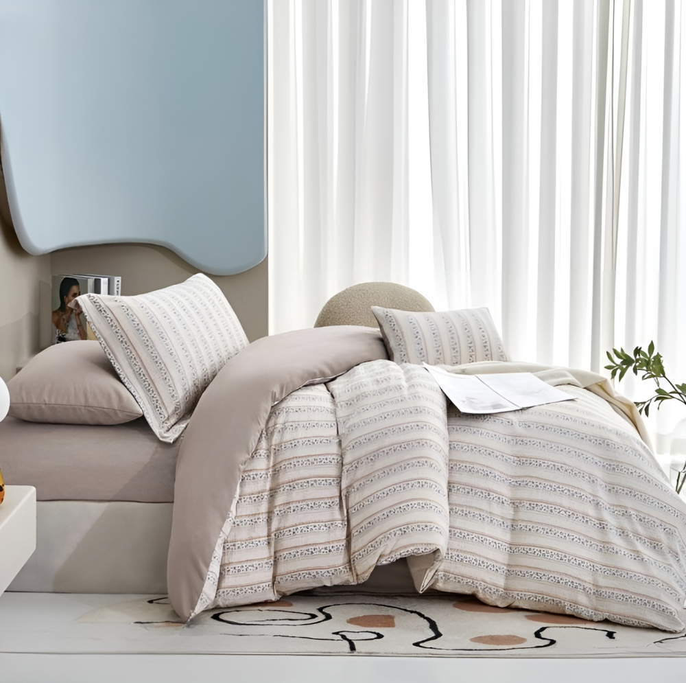 ارتقِ بغرفة نومك مع مفرش CHLOE 04 الصيفي. طقم 5 قطع بخامة خفيفة لا تحتفظ بالحرارة، سهلة الغسيل وسريعة الجفاف لضمان استخدام عملي يومي.